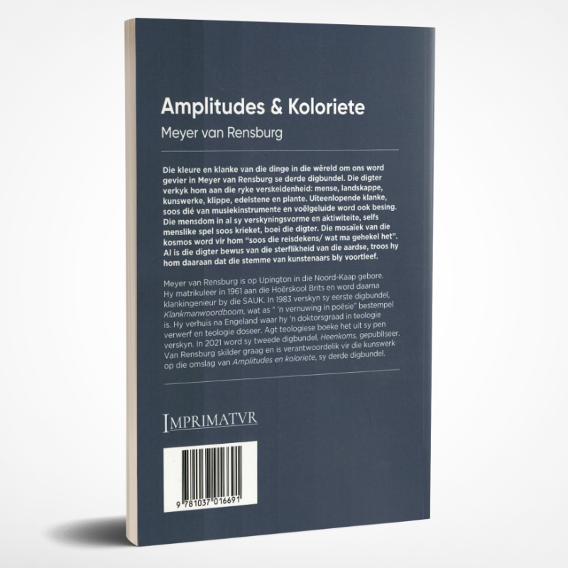 Die kleure en klanke van die dinge in die wêreld om ons word gevier in Meyer van Rensburg se derde digbundel. Die digter verkyk hom aan die ryke verskeidenheid: mense, landskappe, kunswerke, klippe, edelstene en plante.